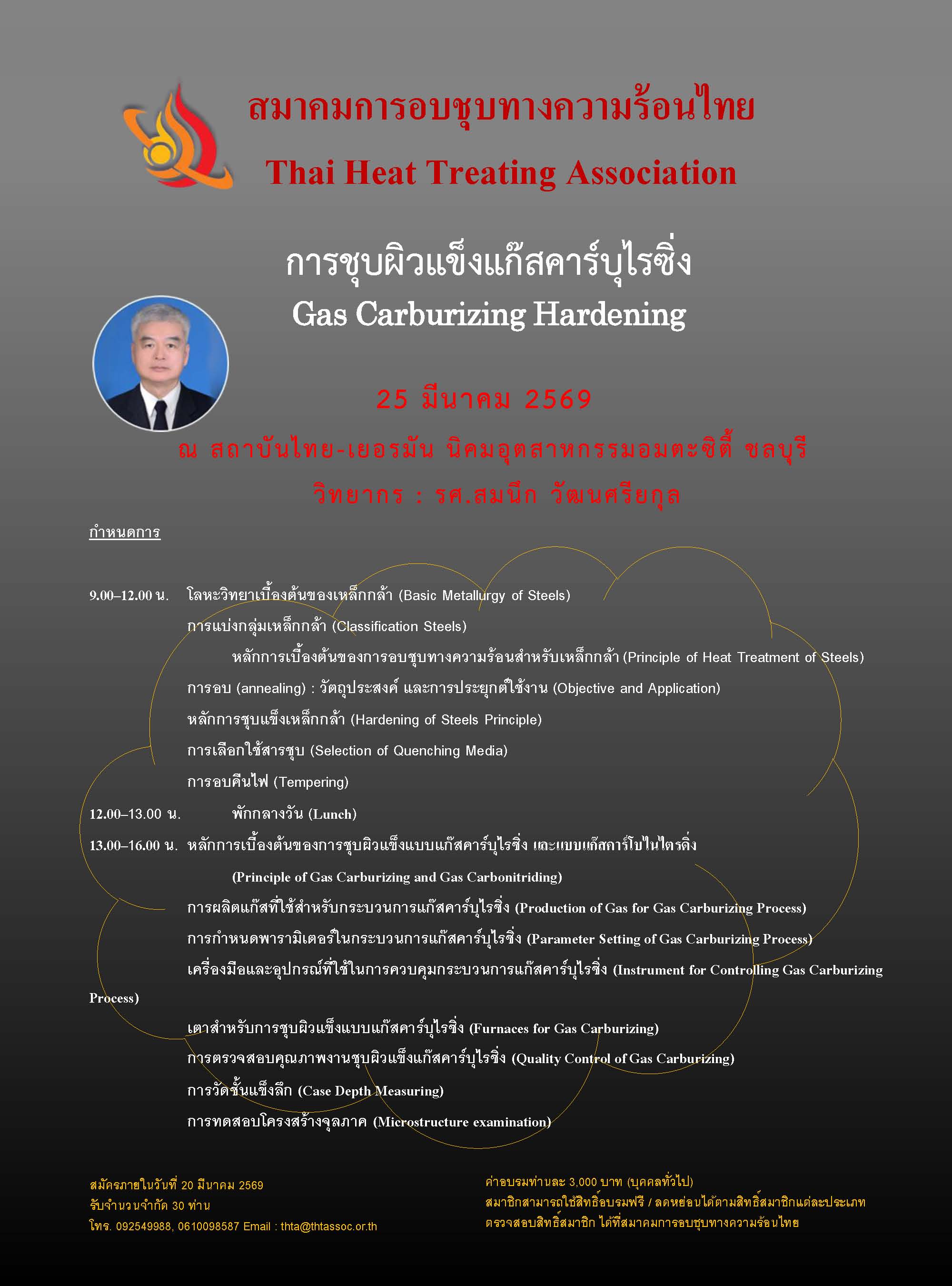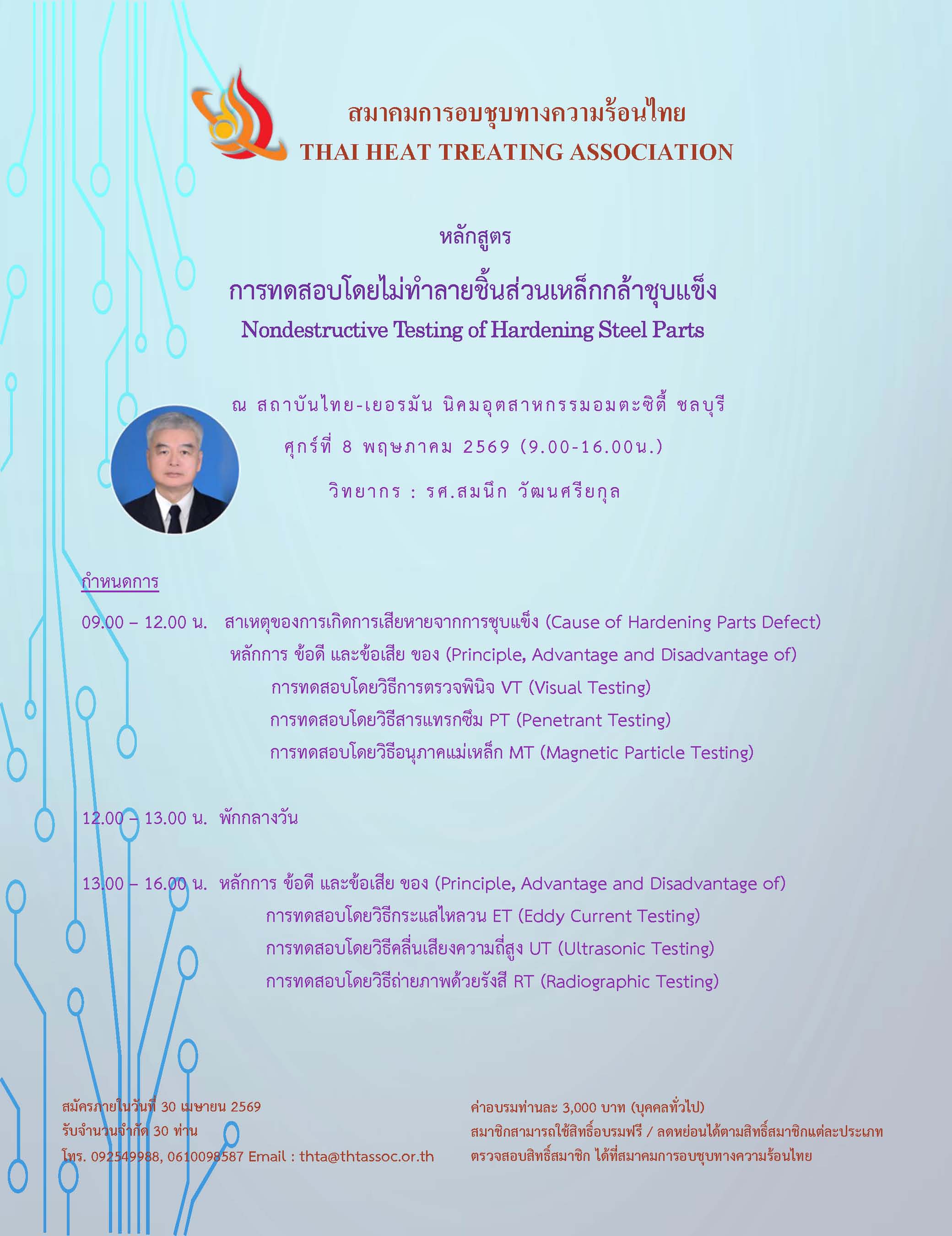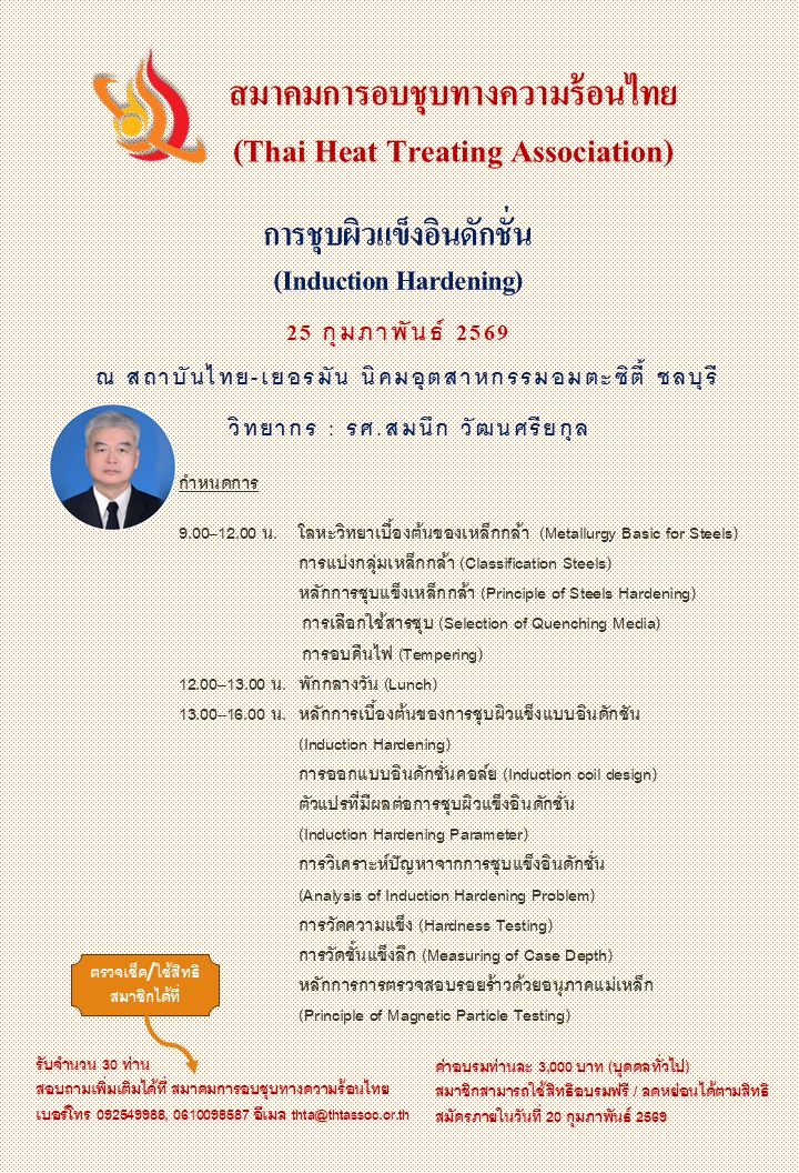 จากความพยายามของกลุ่มคณาจารย์ของภาควิชาวิศวกรรมโลหะการ มหาวิทยาลัยเทคโนโลยีสุรนารีโดยใช้เวลาประมาณ 2 ปี ได้รวบรวมและจัดประชุมผู้ที่สนใจงานด้านการอบชุบทางความร้อน เพื่อจัดตั้ง สมาคมการอบชุบทางความร้อนไทย (Thai Heat Treating Association) บัดนี้สมาคมได้ถูกจัดตั้งขึ้นเรียบร้อยแล้ว โดยได้รับการจดทะเบียนเมื่อวันที่ 25 ธันวาคม 2560 ผมในฐานะนายกสมาคมการอบชุบทางความร้อนไทยคนแรก ใคร่ขอรับการสนับสนุนจากท่านโดยการสมัครเป็นสมาชิกทั้งแบบนิติบุคคลและบุคคล เพื่อให้สมาคมสามารถดำเนินกิจกรรมให้เป็นไปตามวัตถุประสงค์ และพวกเราทุกคนที่ทำงานด้านการอบชุบทางความร้อนจะได้มีจุดยืนในอุตสาหกรรมไทยได้อย่างมั่นคงและยั่งยืนต่อไป
